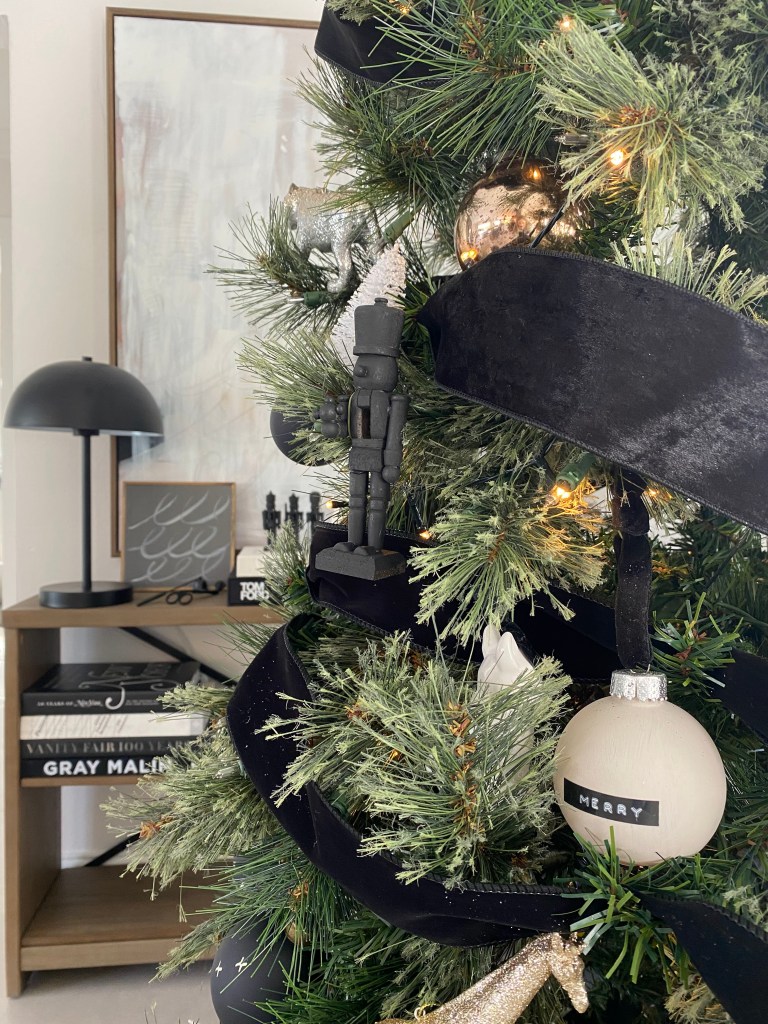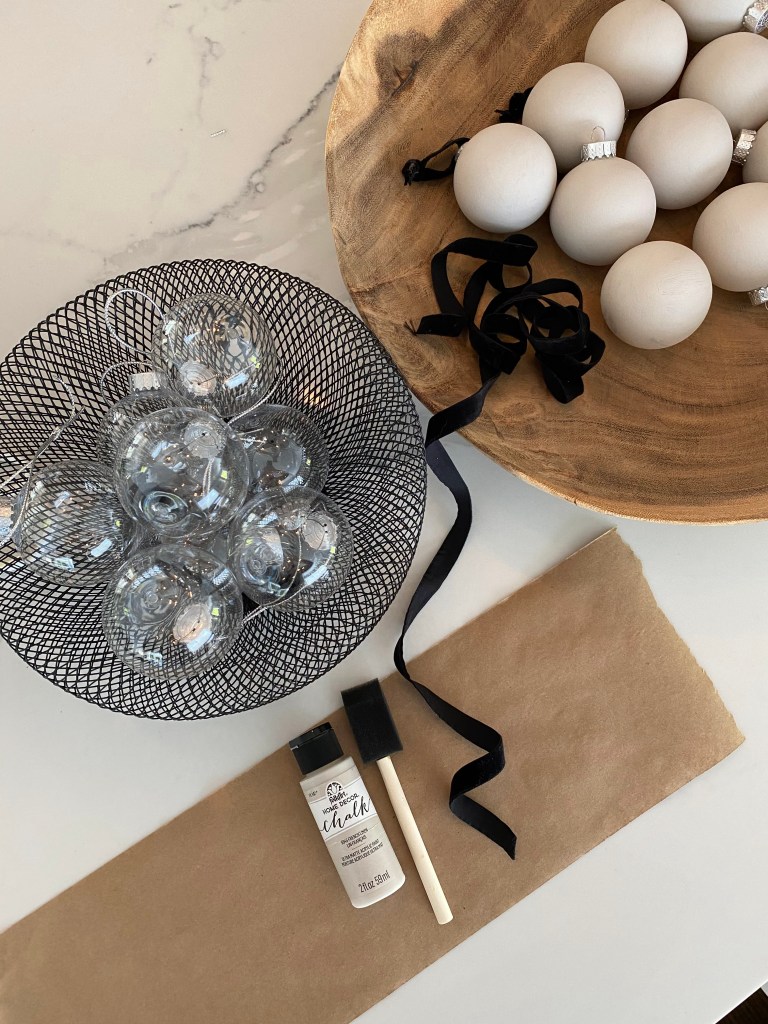 I added three coats of paint to each ornament, let dry, added the label, attached the ornament topper and added the velvet ribbon. I can’t tell you how incredible these look in person. I have added some to my tree and kept the rest to display in the bowl. They look stunning and are so decorative!