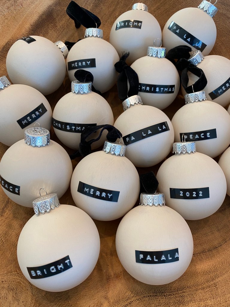 I wanted to create a timeless and neutral DIY this year. I decided to go with a “concrete look” ornament with an embossed Dymo label.
